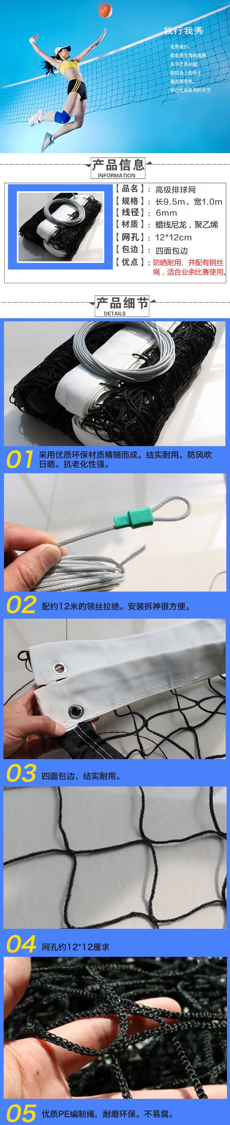 產(chǎn)品尺寸:9.5米*1米,PE材料,線徑:6mm,網(wǎng)孔:12cm*12cm,四面包邊