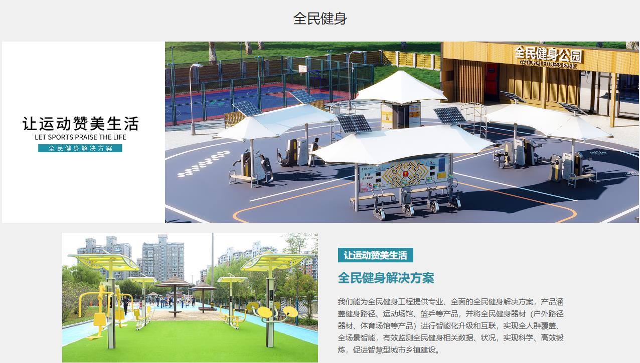 我們能為全民健身工程提供專業(yè)、全面的全民健身解決方案,產(chǎn)品涵蓋健身路徑、運(yùn)動(dòng)場(chǎng)館、籃乒等產(chǎn)品,并將全民健身器材(戶外路徑器材、體育場(chǎng)館等產(chǎn)品)進(jìn)行智能化升級(jí)和互聯(lián),實(shí)現(xiàn)全人群覆蓋、全場(chǎng)景智能,有效監(jiān)測(cè)